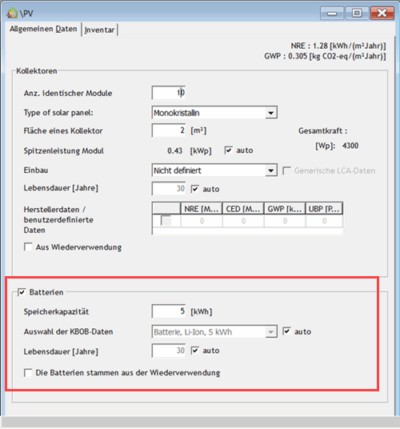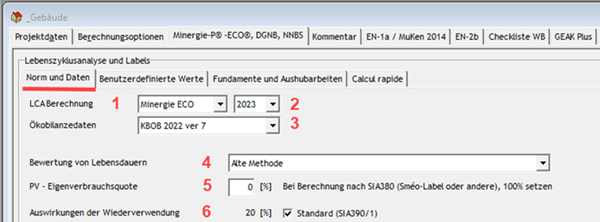 - Es wurde die Möglichkeit hinzugefügt, die Lebensdauer automatisch gemäß den eBKP-H-Codes (gemäß Anhang C der SIA2032) oder gemäß der alten Methode (ECO-Optionen des Gebäudes) festzulegen. Standard: alte Methode: