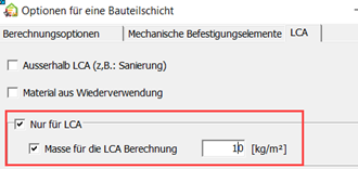 - Möglichkeit, eine Masse (in kg pro m² Element) für ein Material, das als „nur für Ökobilanz“ definiert ist, direkt einzugeben.