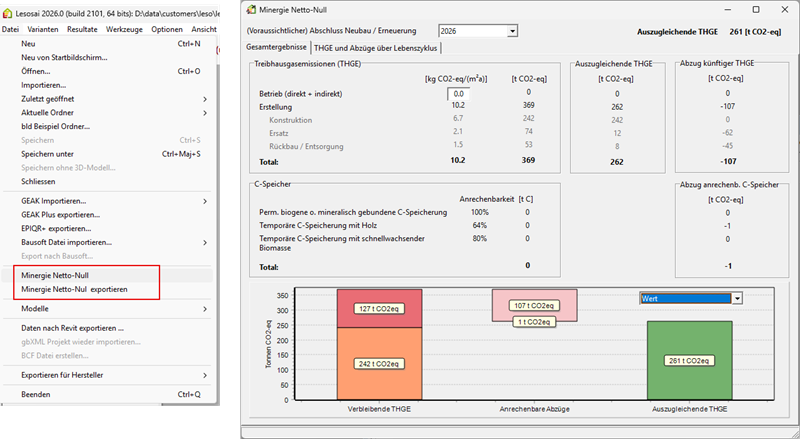 Wenn Sie Ihr ECO-Projekt abgeschlossen haben, können Sie es für das neue Label Minergie Netto-Null nach Excel exportieren oder die Berechnungen Testen. Sie haben zwei Exportmöglichkeiten: über das Menü „Datei” oder über den ECO-Bericht.